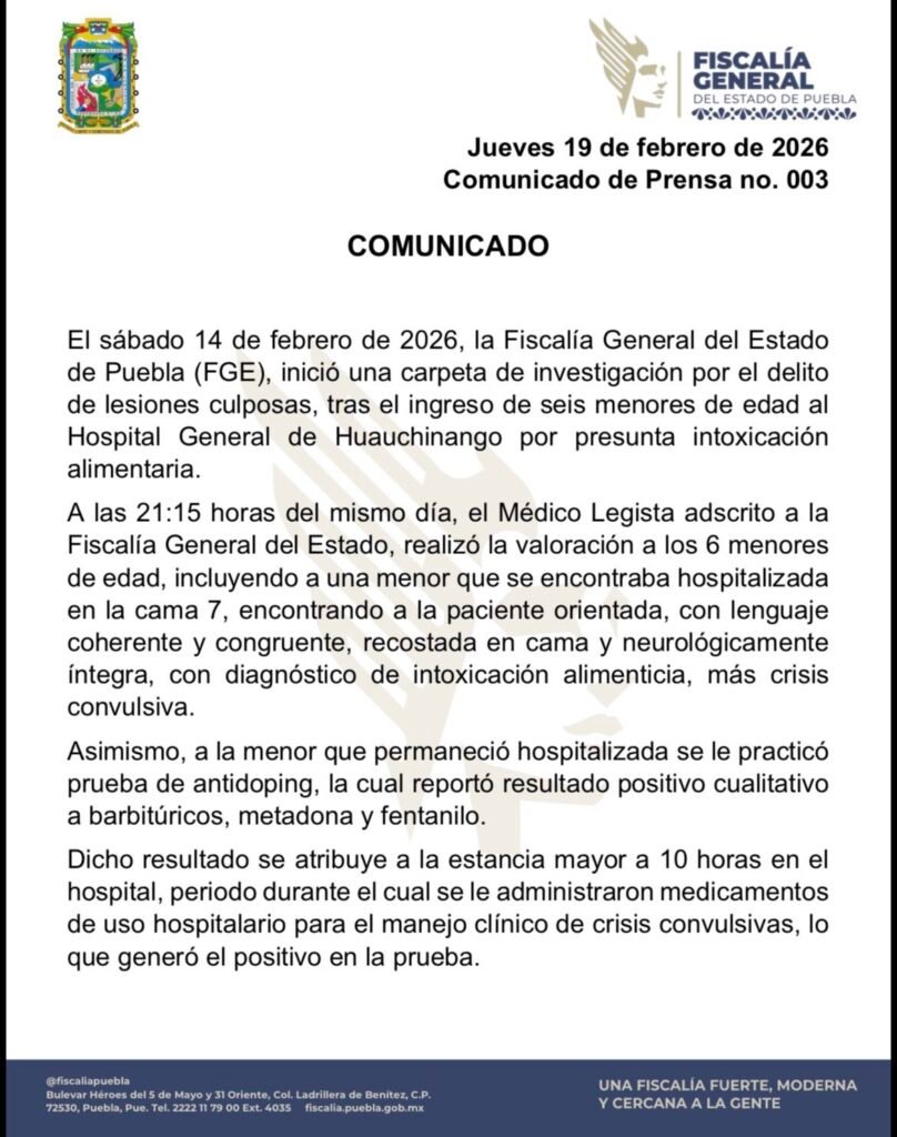 Descarta Fiscalía intoxicación de menores por fentanilo en Huauchinango Huauchinango, Puebla. — Descartó la Fiscalía General del Estado de Puebla...