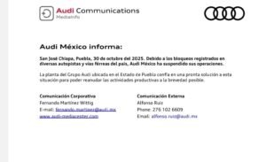 Puebla, Pue., 31 de octubre de 2025.– La empresa automotriz Audi México anunció la suspensión temporal de sus operaciones en...